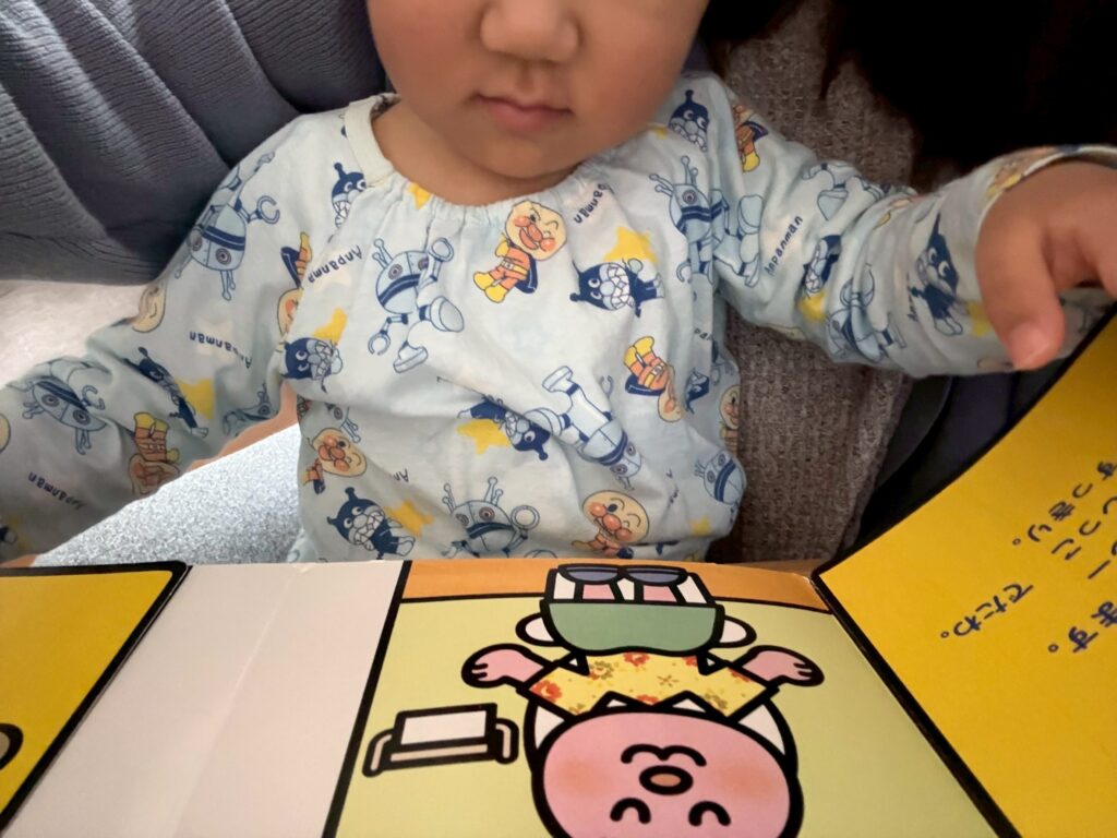 息子は絵本をみて「とんとん。しーし!」とおしっこに反応する、おしっこはトイレでするものとわかるようになった頃、おまるに座り始めました。おしっこは出なくても、パンツを脱いで絵本と同じように「しー」といっていました。
