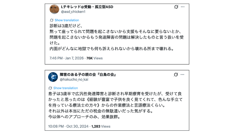 診断は3歳だけど、黙って座ってられて問題を起こさないから支援もそんなに要らないとか、問題を起こさないからもう発達障害の問題は解決したものと言う扱いを受けた。内面がどんなに地獄でも何も訴えられないから壊れる所まで壊れる。