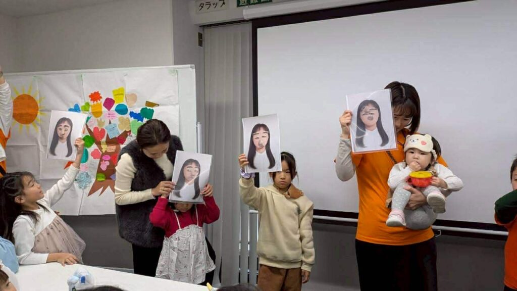 日本の伝統的な遊び、福笑いは、子どもにとって、表情について意識するきっかけにもなります。笑っている顔、怒っている顔…出来上がった作品は、とても面白く、会場が笑いに包まれました。