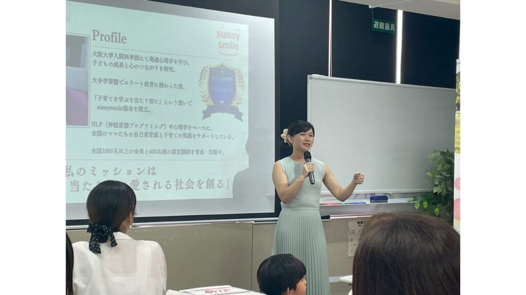 一般社団法人sunnysmile協会の理念は「子育てを学ぶを当たり前の社会に」「子どもの笑顔のためにまずはママの笑顔から」です。これを実現するために、日々活動しています。
