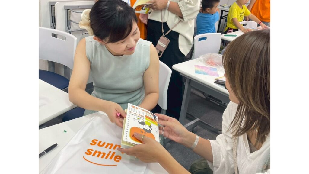 ワークの作業中、一般社団法人sunnysmile協会代表工藤いずみが、各グループのテーブルを周り、交流したり著書にサインしたりしました。