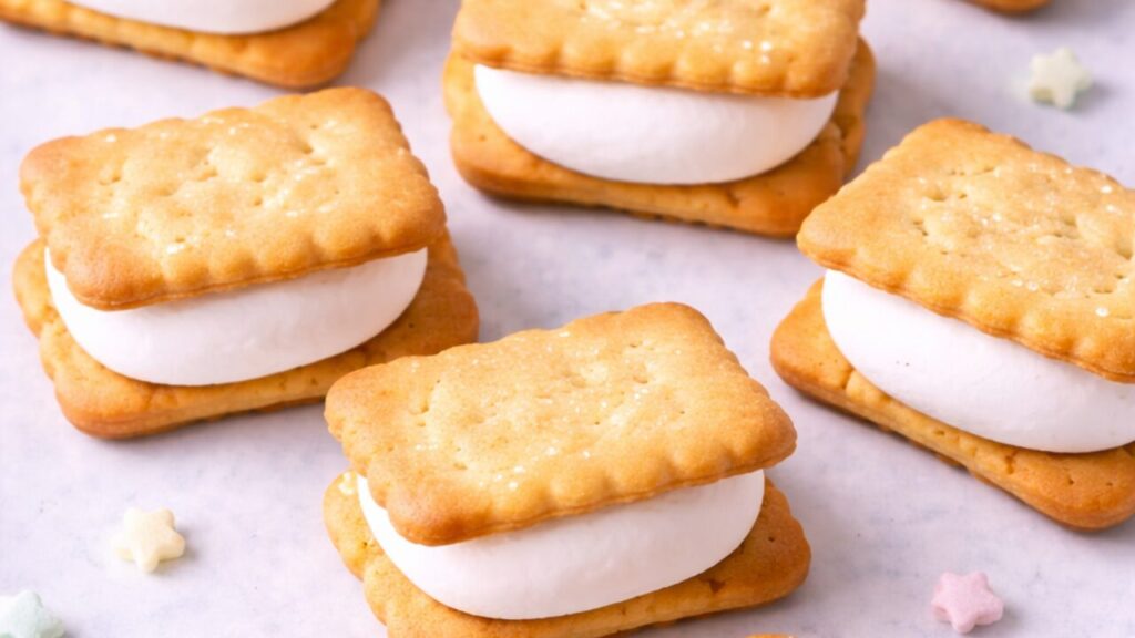 ④マシュマロの上に表向きにビスケットをのせて、ムニッと押してくっつけて完成!