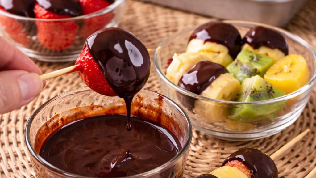 ④冷凍したフルーツをソースにくぐらせると完成!すぐに固まるよ!