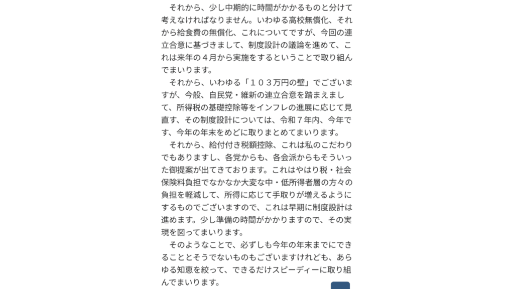 ❝それから、いわゆる「103万円の壁」でございますが、今般、自民党・維新の連立合意をふまえまして、所得税の基礎控除等をインフレの進展に応じて見直す、その制度設計については、令和7年、今年です、今年の年末をめどに取りまとめてまいります。❞