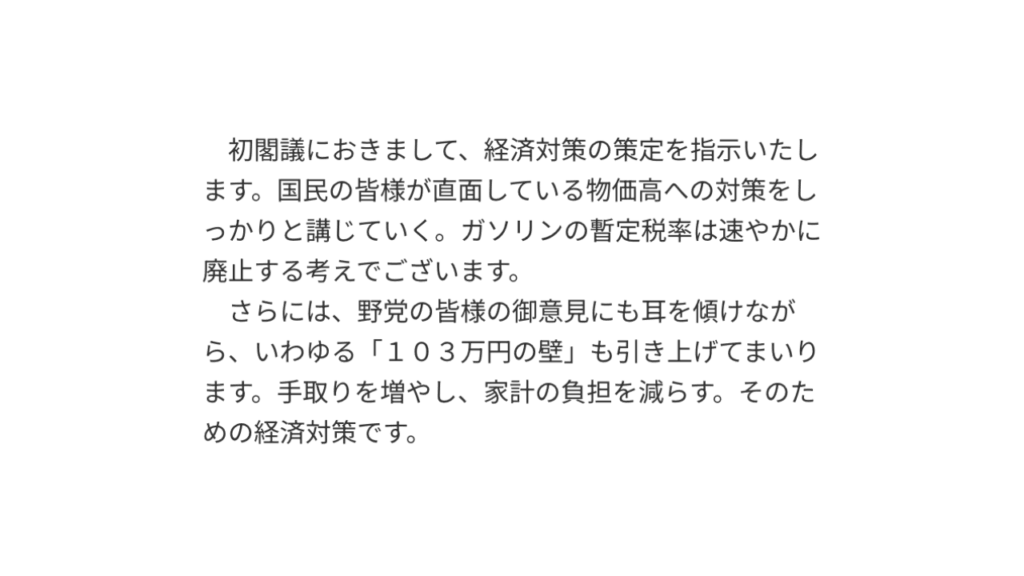 ❝さらには、野党の皆様のご意見にも耳を傾けながら、いわゆる「103万円の壁」も引き上げてまいります。手取りを増やし。家計の負担を減らす。そのための経済対策です。❞