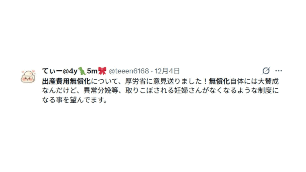 ❝出産費用無償化について、厚生労働省に意見送りました!無償化自体には大賛成なんだけど、異常分娩等、とりこぼされる妊婦さんがなくなるような制度になることを望んでいます。❞