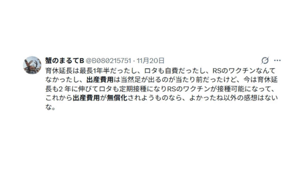 ❝育休延長は最長1年半だったし、ロタも自費だったし、RSのワクチンなんてなかったし、出産費用は当然足が出るのが当たり前だったけど、今は育休延長も2年に伸びてロタも定期接種になりRSのワクチンが接種になって、これから出産費用が無償化されようものなら、よかったね以外の感想はないな。❞
