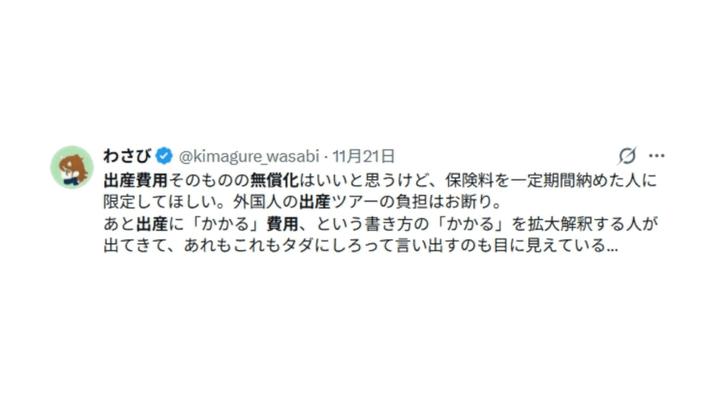 ❝出産費用そのものの無償化はいいと思うけど、保険料を一定期間納めた人に限定してほしい。外国人の出産ツアーの負担はお断り。あと出産に「かかる」費用、という書き方の「かかる」を拡大解釈する人が出てきて、あれもこれもタダにしろって言いだすのも目に見えている…❞