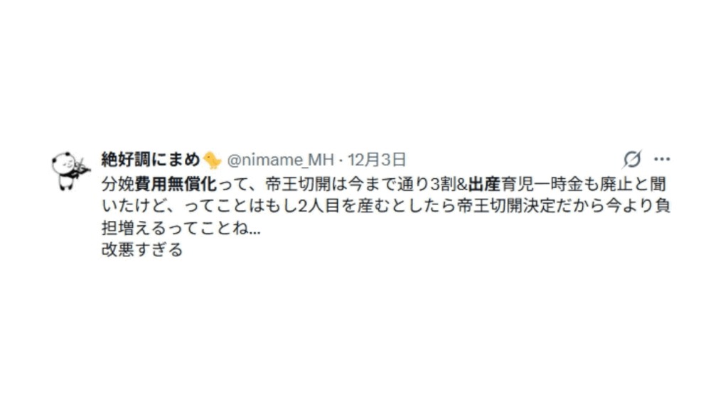 ❝分娩費用無償化って、帝王切開は今まで通り3割&出産育児一時金も廃止と聞いたけど、てことはもし2人目を産むとしたら帝王切開決定だから今より負担増えるってことね…改悪すぎる❞