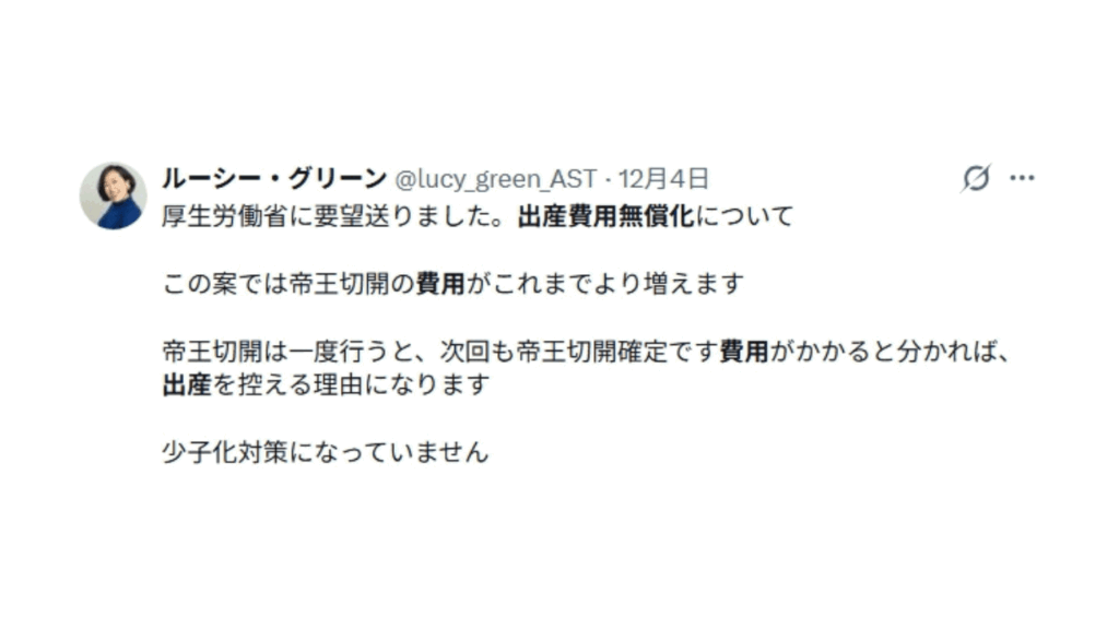 ❝厚生労働省に要望送りました。出産費用無償化について。この案では帝王切開の費用がこれまでより増えます。帝王切開は一度行うと、次回も帝王切開確定です。費用がかかると分かれば、出産を控える理由になります。少子化対策になっていません。❞