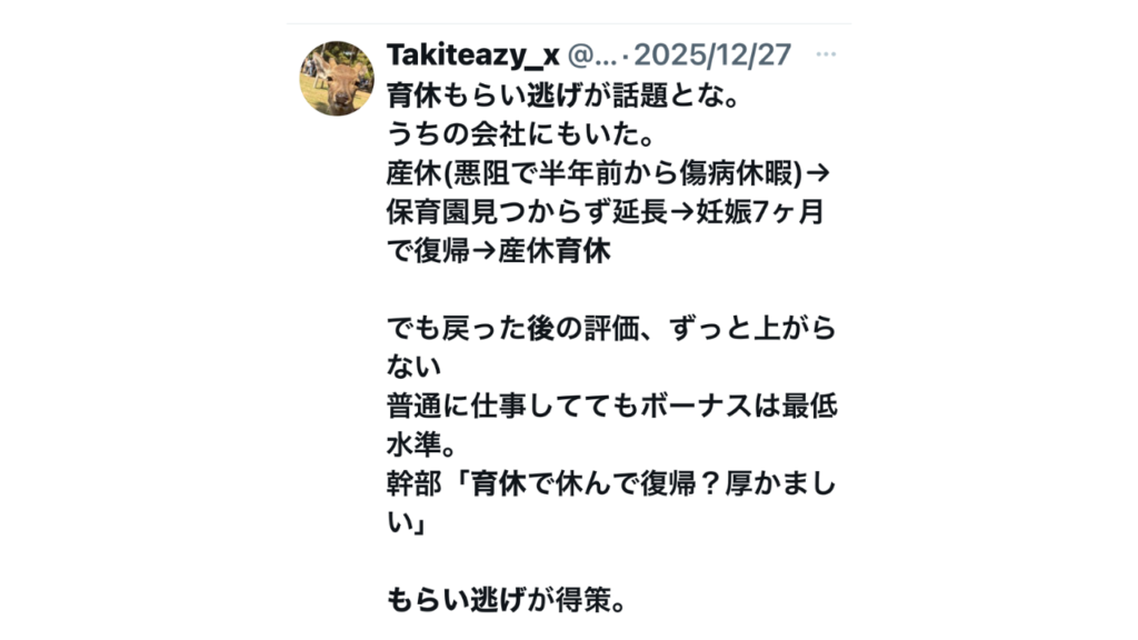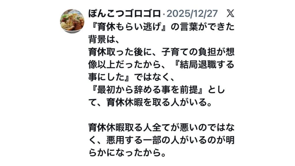 そんな中、2025年の12月に育休後退職についてメディアに取り上げられ、「育休もらい逃げ」の話題が盛り上がりました。X(旧Twitter)での反応を探してみました。
