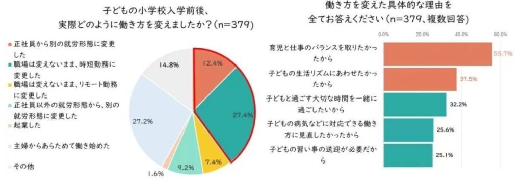 放課後NPOアフタースクールが実施した、「小1の壁」に関する調査(23年2月、1都3県で働く女性1000人によるアンケート)によると、子どもの小学校入学をきっかけに【働き方を変えた人は37.9%】という結果が出ています。