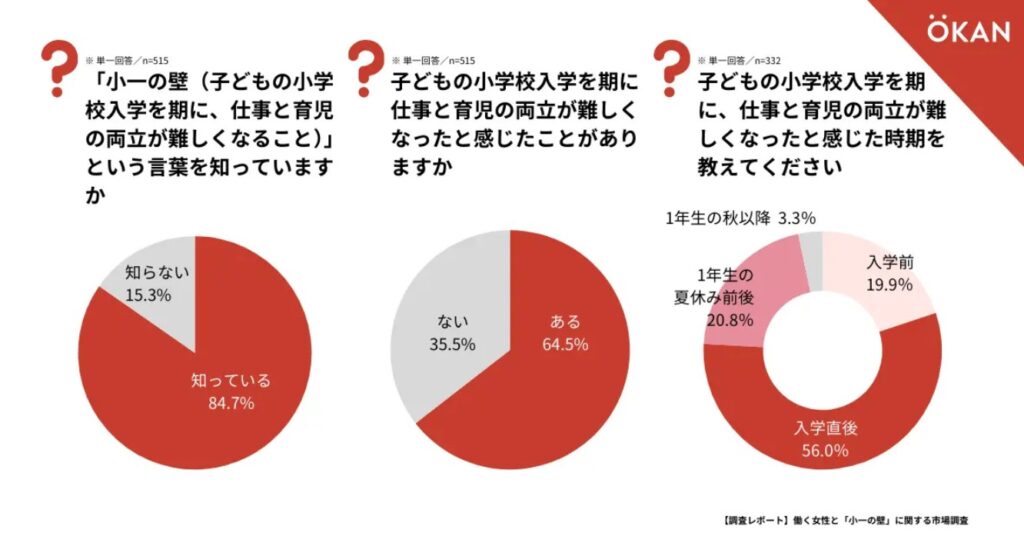 株式会社OKANが2025年2月に実施した小1の壁の調査(第1子の小学校入学「前」「後」ともに被雇用者として働いていたママが対象)は、小学校入学を機に「仕事と育児の両立が難しくなったと感じたことがある」と回答した人は64.5%で、多くのママが悩んでいることが分かります。